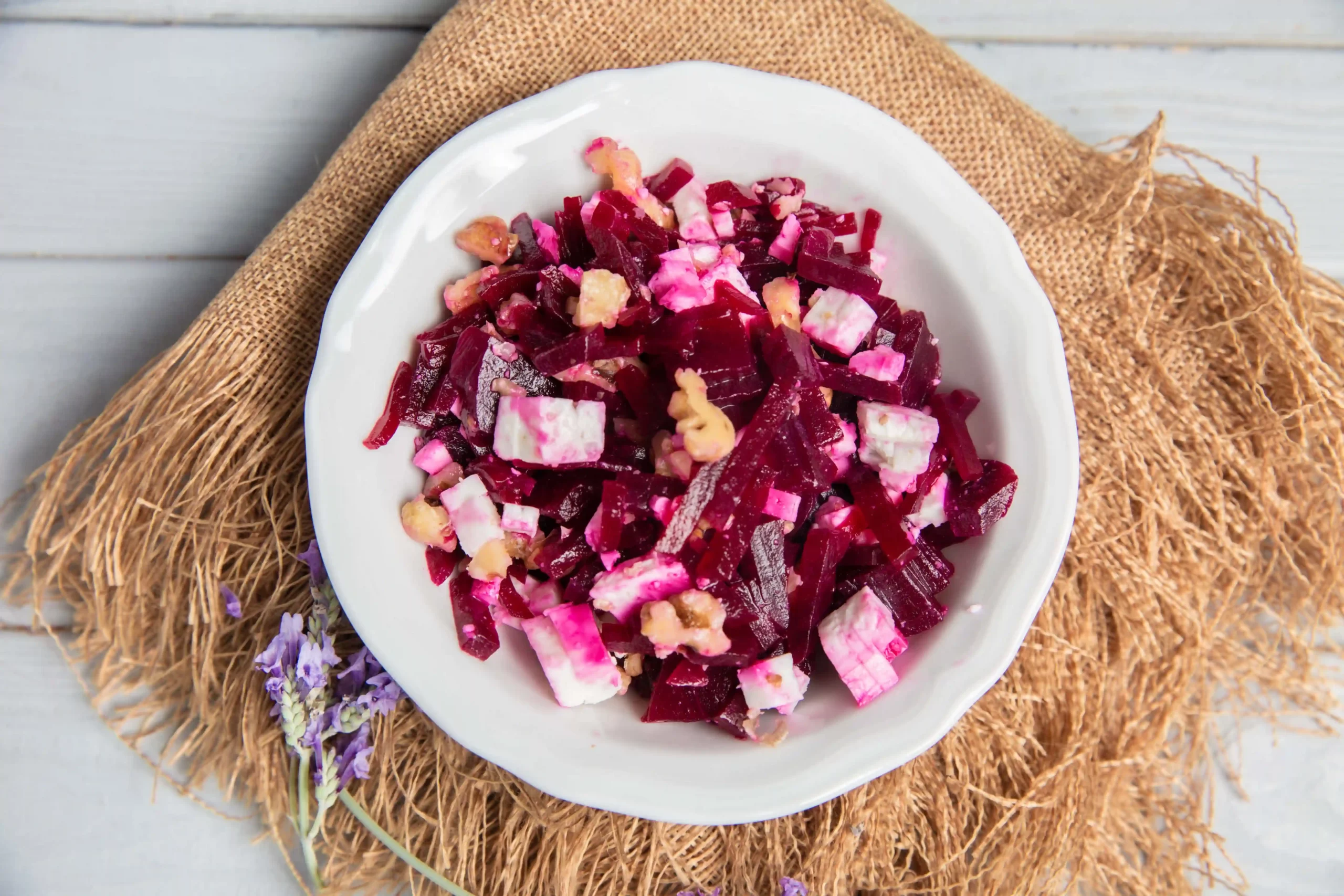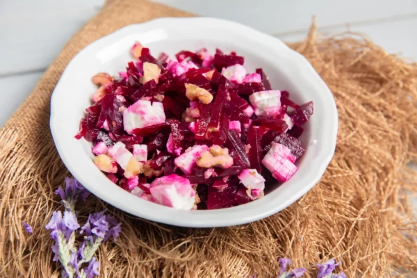סלט סלק מרענן עם גבינה בולגרית ואגוזים.